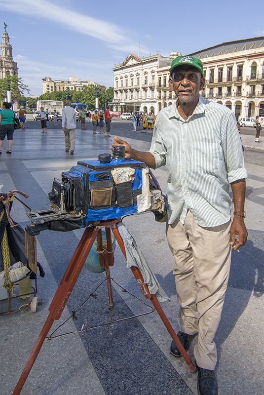 Henri Cartier-Bresson always avoided being photographed, believing that the photographers image should be personal not public. This concept was taught to me by my early teachers, this is a strange thing in the era of selfies. But Sandie and I were on assignment in Cuba and came across this tall street photographer with his wife and son. They were on the steps of the old Capitol building in Havana. We were there to photograph the El Capitolio Nacional de La Habana building which is a close copy of the one in Washington USA. It was not used by the Cuban government for various political reasons and was showing signs of decay, decay partially due to Cuba being under embargo from the the USA. The upside of this is the incredible ingenuity of the Cuban population. Most people know of the old cars of the 1958 era, still running with Russian tractor motors, stunning architecture and wonderful Cuban music. But this photographer was amazing and demonstrated the unique character of the Cuban people.